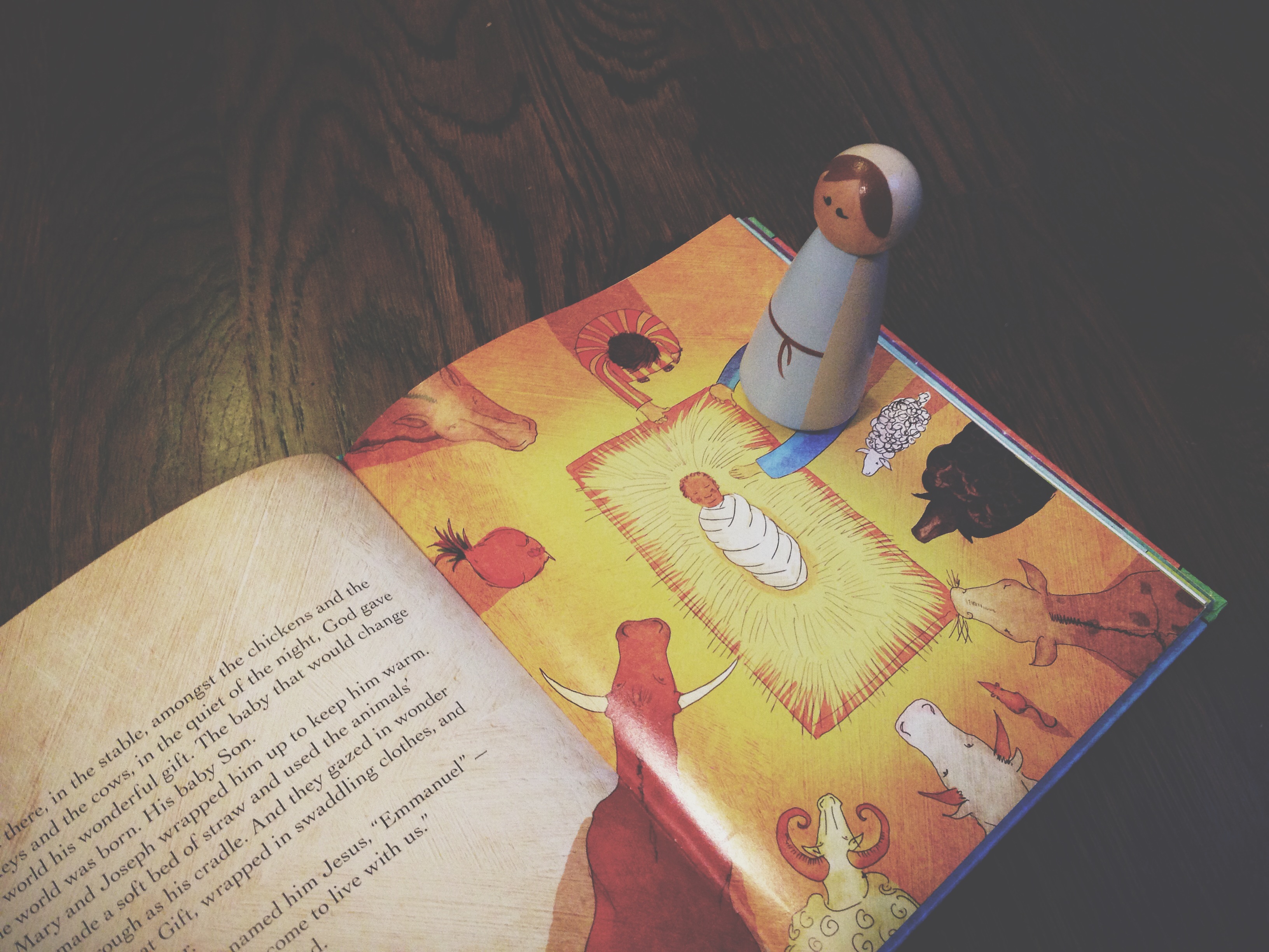 What I want to talk about this morning is what happened two nights ago, when the little wooden Baby Jesus could not be found. Anne and I were finishing a dinner conversation, and from the next room we could hear Alice walking around saying, “Baby Jesus, where are you?” A few minutes later we heard, “There you go, Mommy, there’s Baby Jesus.” And what we found in the adjacent room is pictured at the top of this post. Alice had searched and searched for the wooden Baby Jesus to no avail, so she found the picture of the manger scene in her Jesus Storybook Bible and placed Mary (Mommy) right on top of the two-dimensional Mary on the page, and positioned her looking directly at her baby.